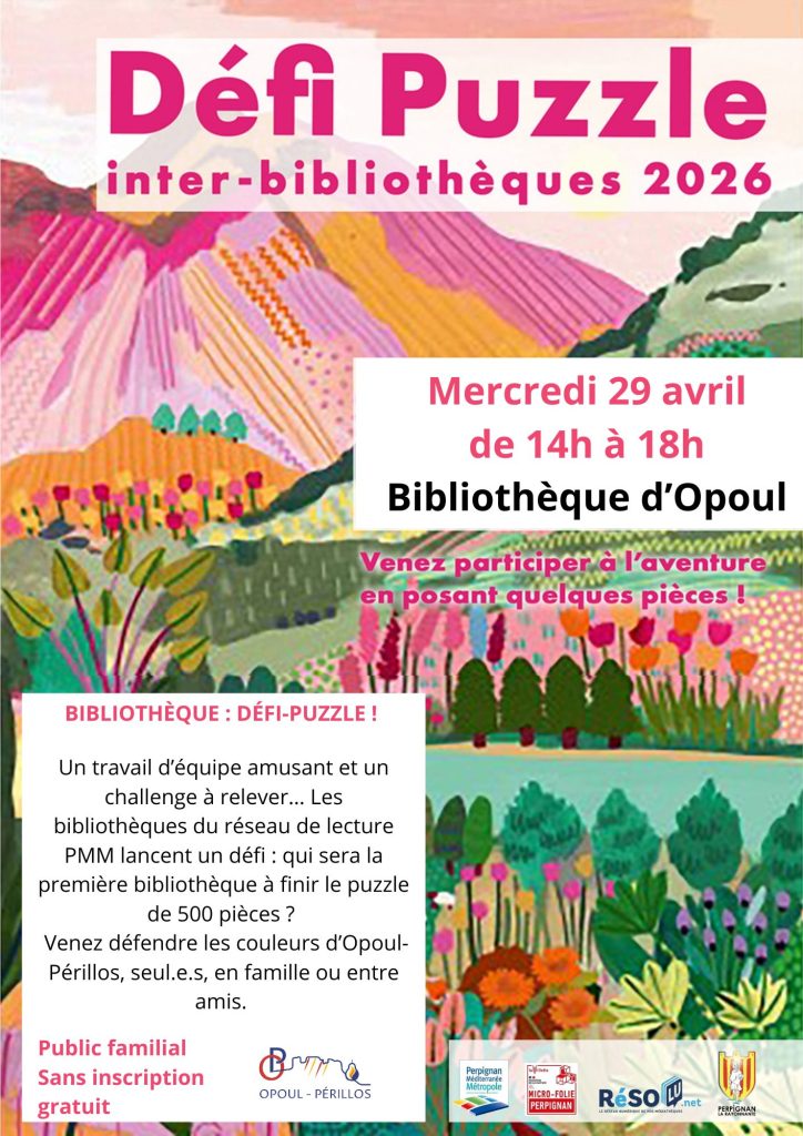 BIBLIOTHÈQUE : DÉFI-PUZZLE, MERCREDI 29 AVRIL 2026 de 14h à 18h à la bibliothèque d'Opoul-Périllos. Un travail d’équipe amusant et un challenge à relever… Les bibliothèques du réseau de lecture...