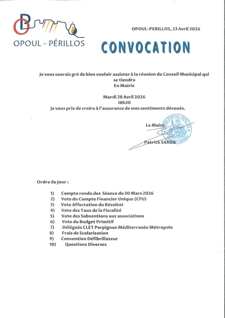 Nous vous informons que le prochain conseil municipal est reporté le mardi 28 avril 2026 à 18h30 en...