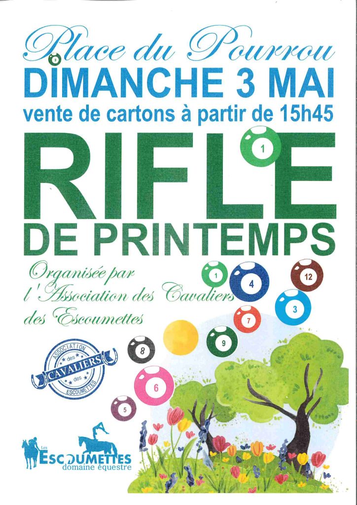 Nous vous informons que le dimanche 03 mai 2026 à partir de 15h45 aura lieu sur la Place du Pourrou une rifle de printemps organisé par l'association les "Cavaliers des Escoumettes". Buvette sur...