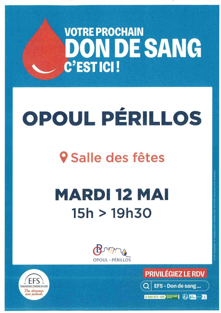 Votre prochain DON DE SANG c’est pour quand ? Nous vous donnons RDV à Opoul Périllos, mardi 12 mai de 15h à 19h30 à la salle des Fêtes. Avec ou sans RDV nous avons besoin de vous :...