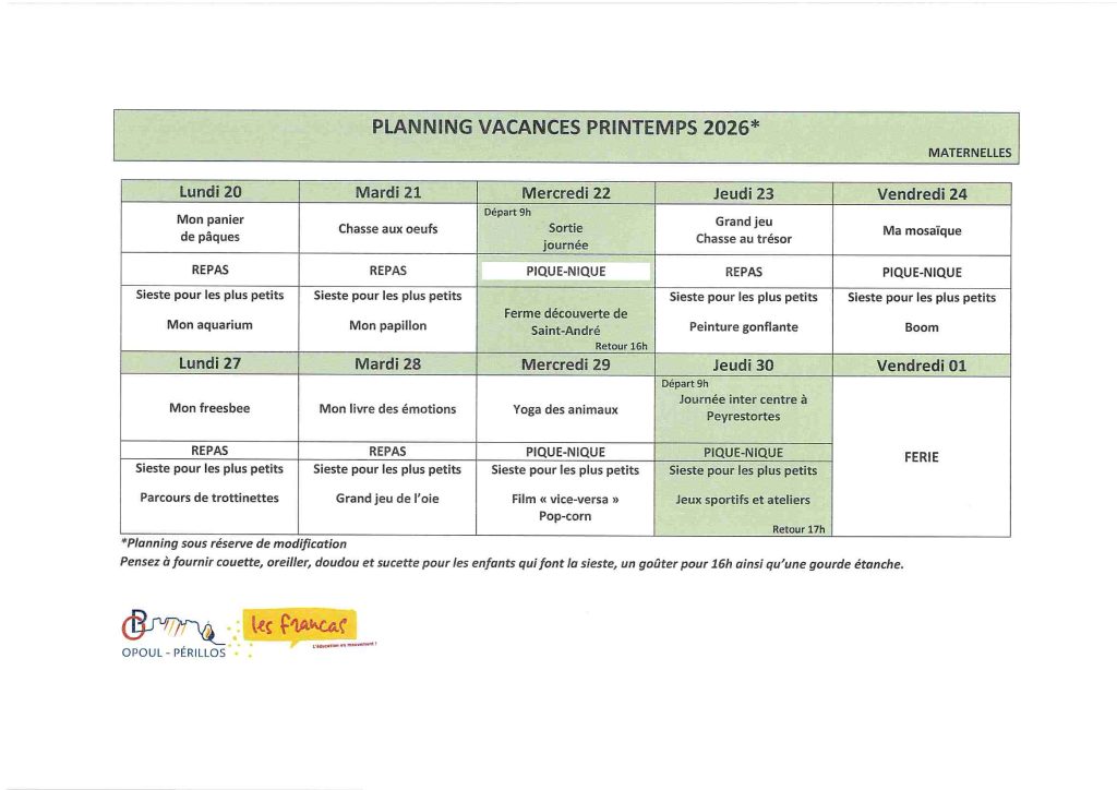 Nous vous informons que les vacances de Printemps auront lieu du lundi 20 avril au jeudi 30 avril 2026.